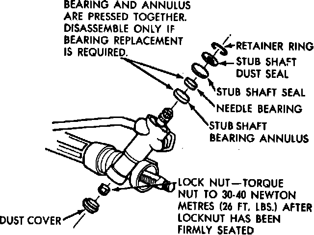 12. Install stub shaft bearing, seal, dust seal and retaining ring. While holding stub shaft in position, torque locknut to 26 ft. lbs..