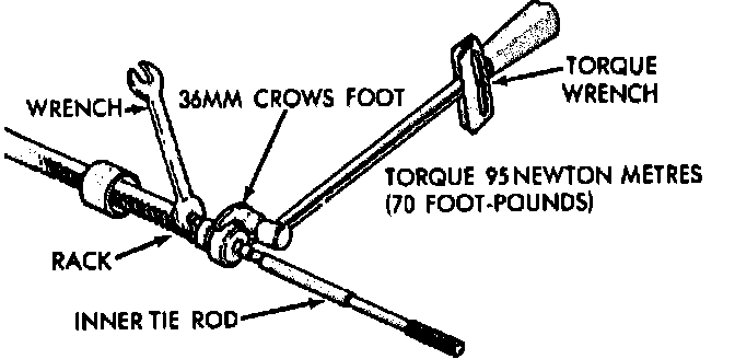 14. Install tie rod assembly on rack. While holding rack in position with a wrench, torque tie rod housing to 70 ft. lbs.. If rack is not held in position when tightening tie rod housing, damage to rack or pinion teeth may result.