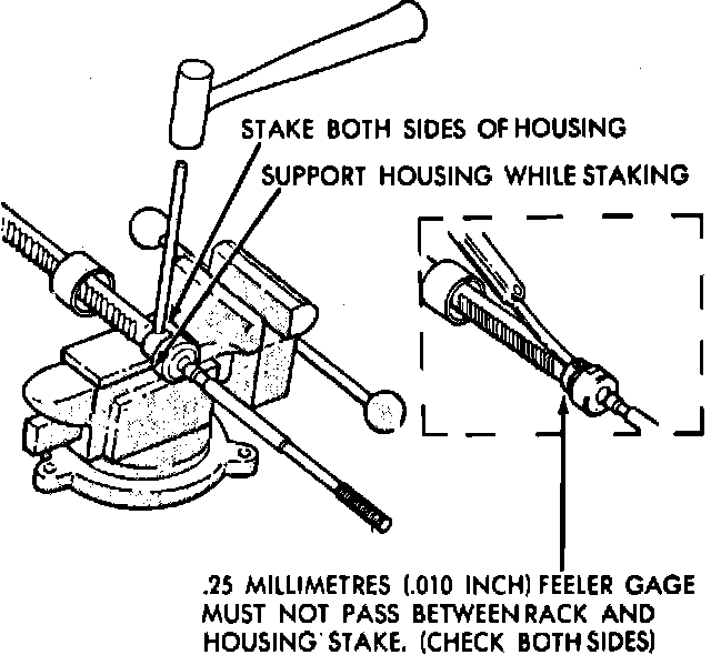 15. Support rack and housing, then stake tie rod housing to rack flats. Using a feeler gauge check clearance between stakes and rack flats. Clearance must not exceed 0.010 inch.