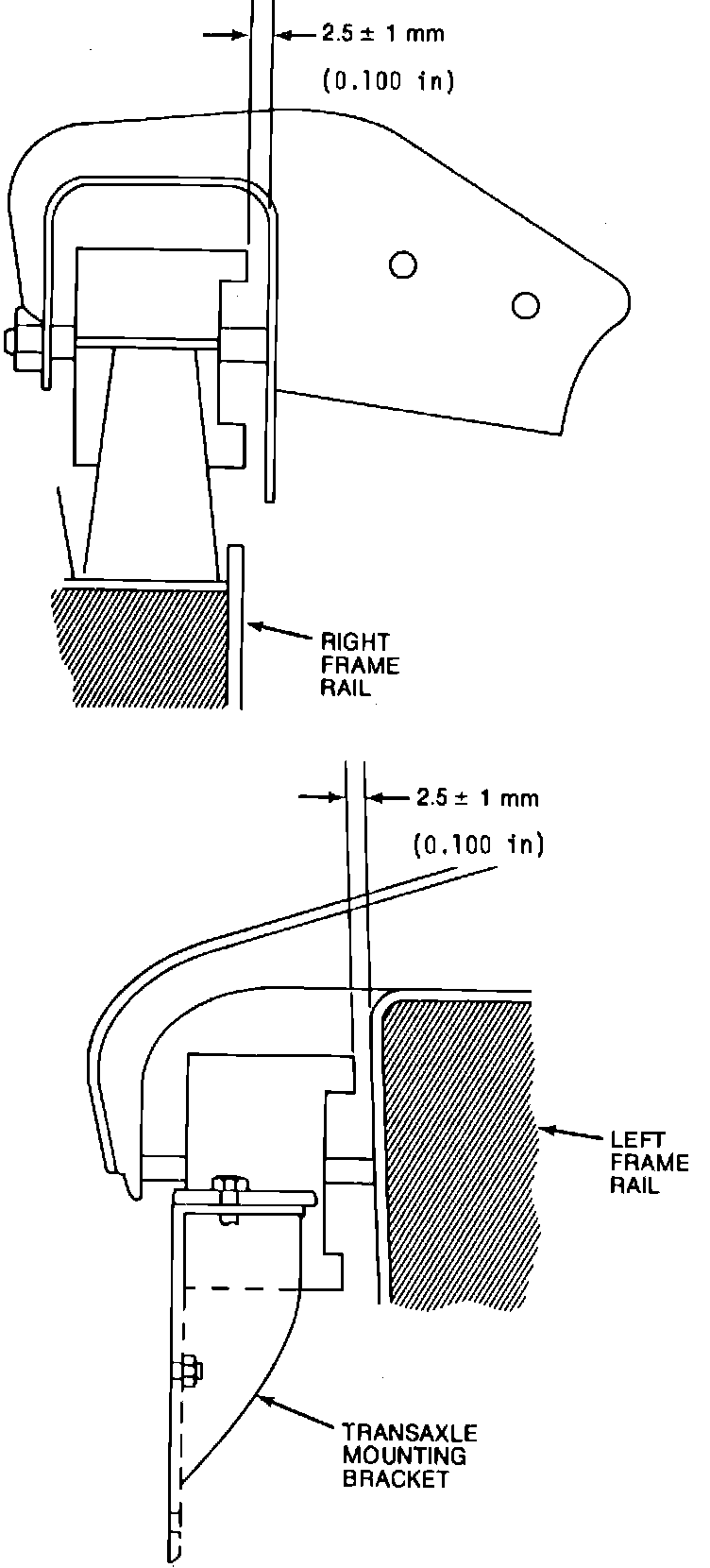 b. Loosen right and left engine mount vertical fasteners and front engine mount bracket to front crossmember bolts. The right and left engine mount rubber bushings should be positioned to provide approximately 0.06---0.14 inch clearance between bushing and supporting bracket. When bracket movement is required, it will be necessary to obtain proper bushing to bracket clearance as well as proper driveshaft length.