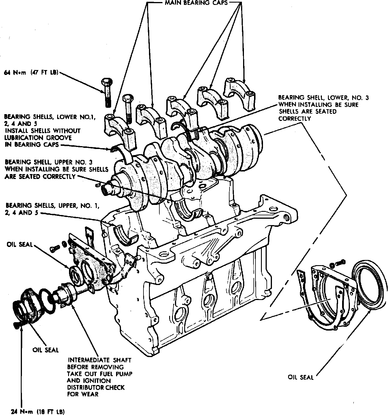 Main bearings are available in standard sizes and undersizes of 0.25, 0.50 and 0.75 mm. Refer to Fig. 13 for bearing installation.