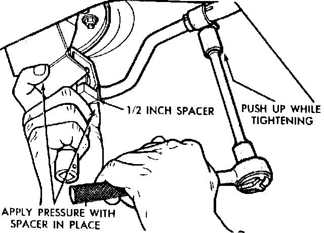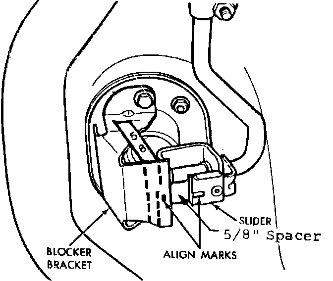 4. Install a 1/2 inch spacer to set gearshift unit lock-out. If blocker bracket has a 5/8 stamp imprint at forward vertical face of the reinforcement strap, it indicates that a 5/8 inch spacer must be used in place of the 1/2 inch spacer.