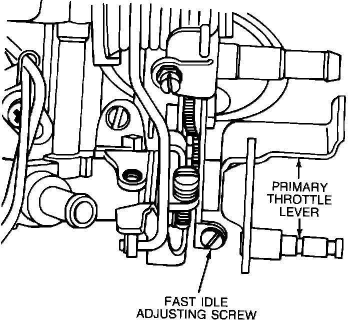Fast idle speed is adjusted by turning the fast idle speed screw on the under side of the primary throttle lever (Figure 3).