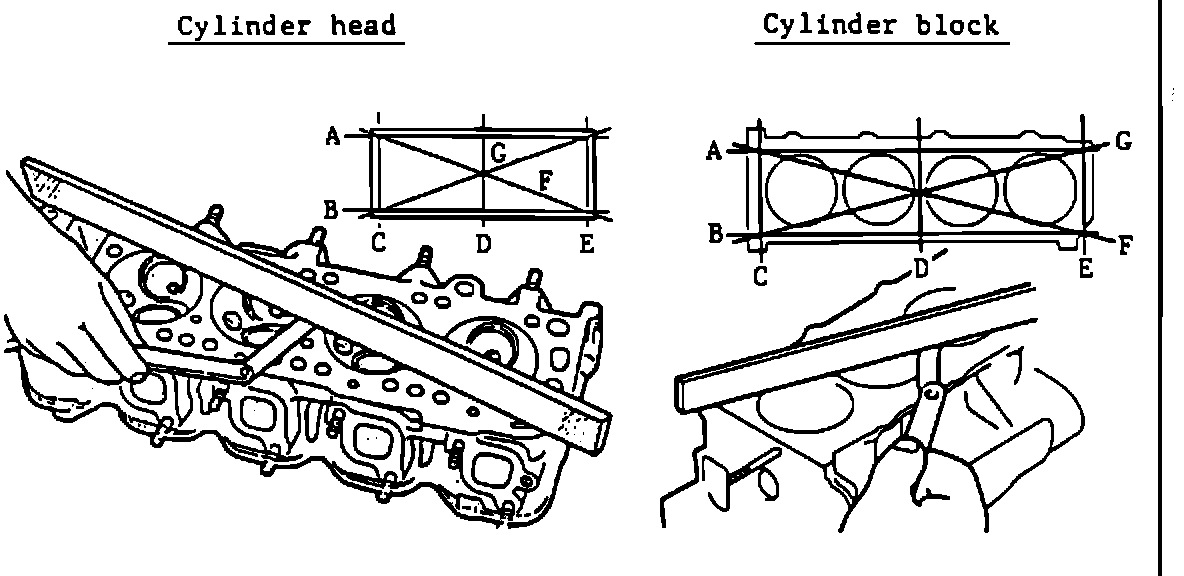 Measure the cylinder head and/or cylinder block using a straight edge and feeder gauge as shown in Figure 1. The maximum out-of-flat limits are: