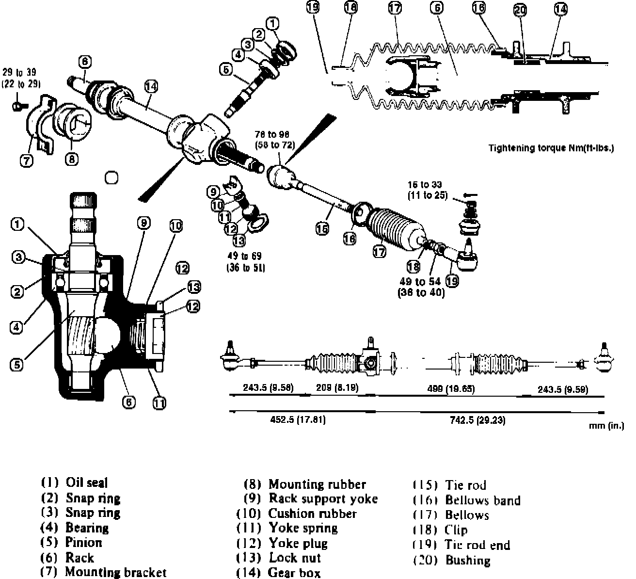 8. Preload of pinion should be measured by turning pinion at rate of a revolution every 4 to 6 seconds using tool No. MB990228. Preload should be 3.6-9.6 in. lbs. (.4-1.1 Nm). The rack starting force should be 11-66 lbs. If measured values are not within specifications, replace cushion rubber and yoke spring and readjust as in step 6. Pinion preload should be measured over full stroke of rack.