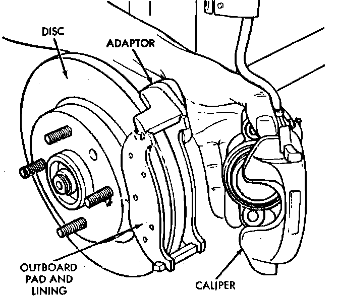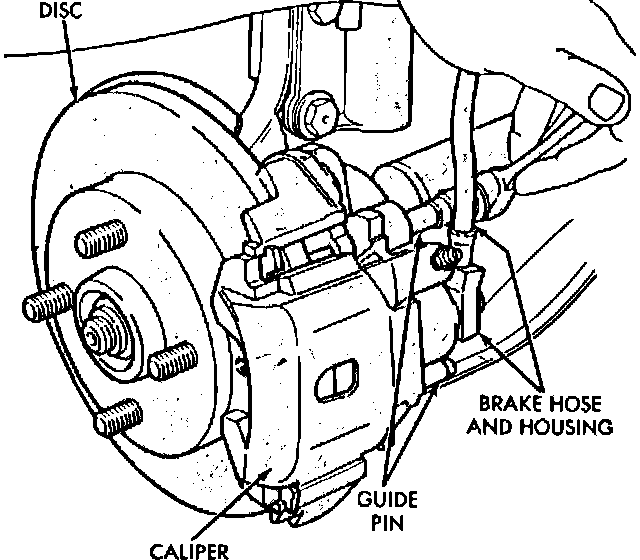 3. Loosen, but do not remove, caliper guide pins, then remove caliper from disc. Inboard shoe will remain inside caliper. Support caliper assembly to prevent damage to hydraulic brake hose. Remove caliper guide pins only if bushings or sleeves are to be replaced.