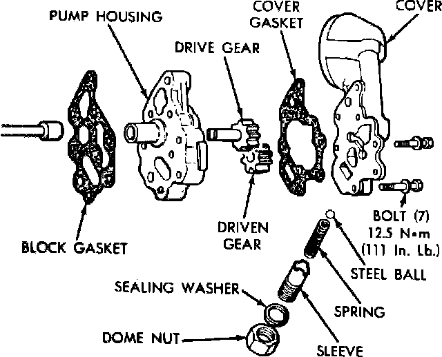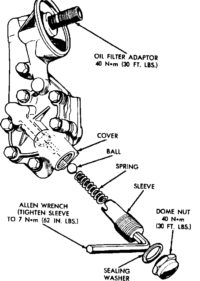 2. Disassemble oil pressure relief valve by unscrewing dome nut and removing sealing washer.