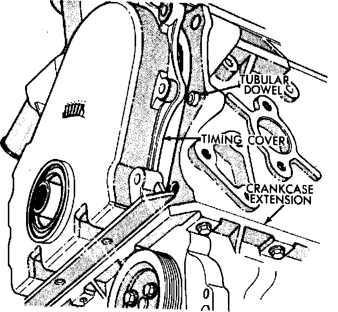 8. Remove crankcase extension to cover screws and the cover to block attaching screws. Two cover to block screws extend through tubular locating dowels, Fig. 11. During removal, ensure dowels do not fall into crankcase extension.