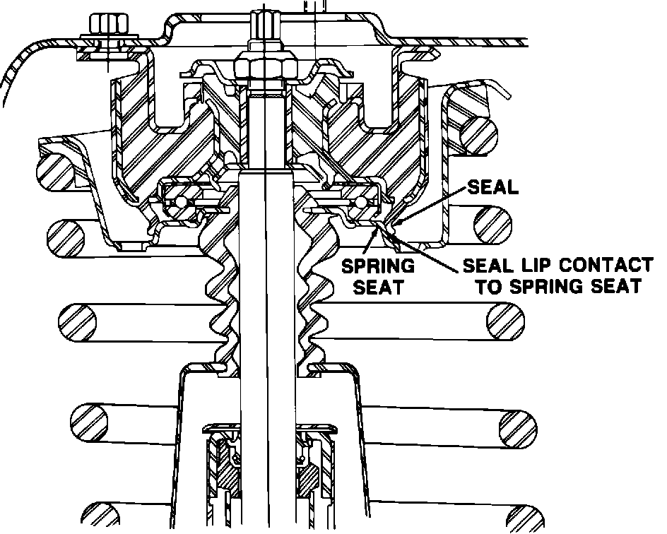 Remove strut assembly and install revised Spring Seat PN 4322701. The revised spring seat will eliminate the seal lip contact to the spring seat. This will require marking the camber adjusting cam and strut to insure proper alignment when reinstalling. Be sure to use the "C" clamp procedure as outlined in the appropriate service manual when reinstalling the strut for proper camber positioning. Follow the strut removal, disassemble, and reinstalling procedure in the appropriate service manual.