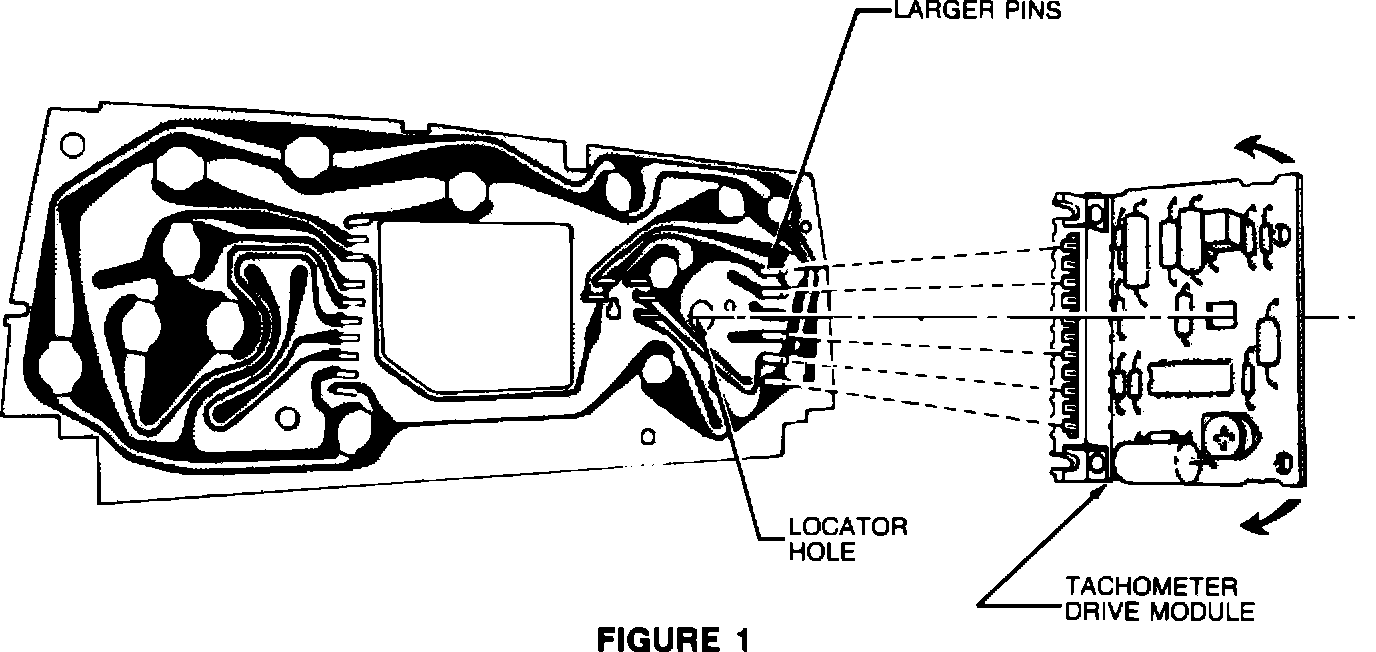 5. Carefully install tachometer drive module over printed circuit board pins and locator. If square hole in drive module doesn't line up with locator, remove module and reinstall. Do not try and force or twist drive module to fit over locator. then-positioned properly, hole in drive module will easily align with locator on instrument cluster. Reinstall drive module screw.