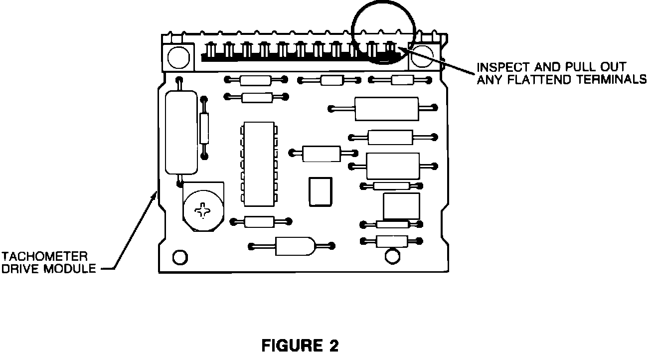 4. Inspect tachometer drive module terminals. If any are flattened, pull terminals out with paper clip, etc. to assure proper contact is made when installing module to printed circuit board (Figure 2).