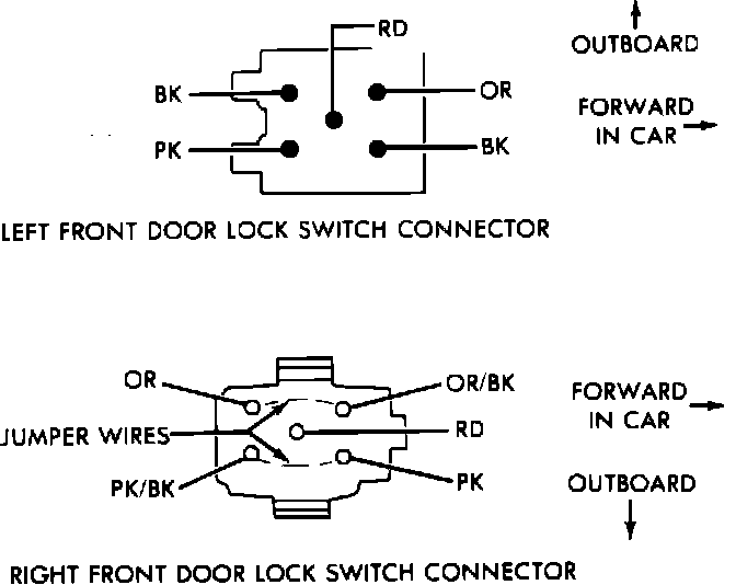 1. Remove the right door switch from the door panel and disconnect the wires from the back of the switch. Connect jumper wires as indicated to the right door wiring harness. These jumper wires take the place of the switch in the inactive position. Operate the door locks using the left door switch.