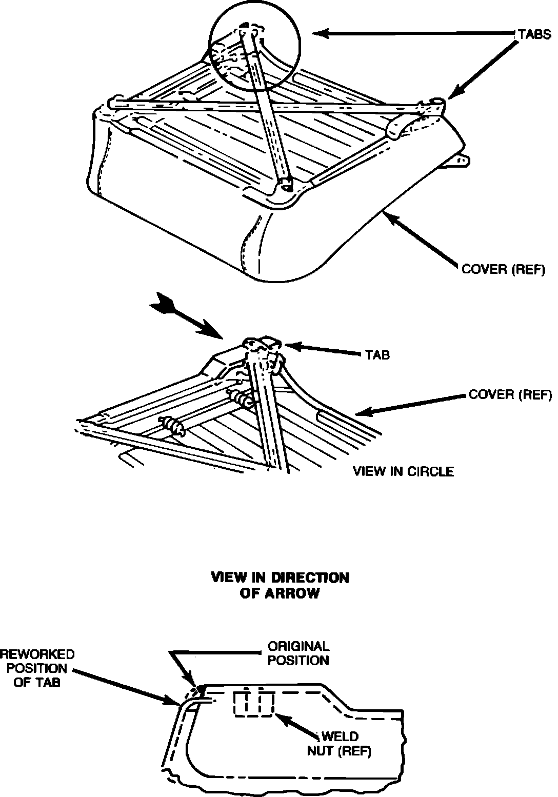 10. Using a suitable tool, bend the tabs away from the seat tracks (upward in car position) until the tabs have a minimum of 1/8" clearance to the side reinforcements (containing the track mounting weld nuts) - (Figure 2).