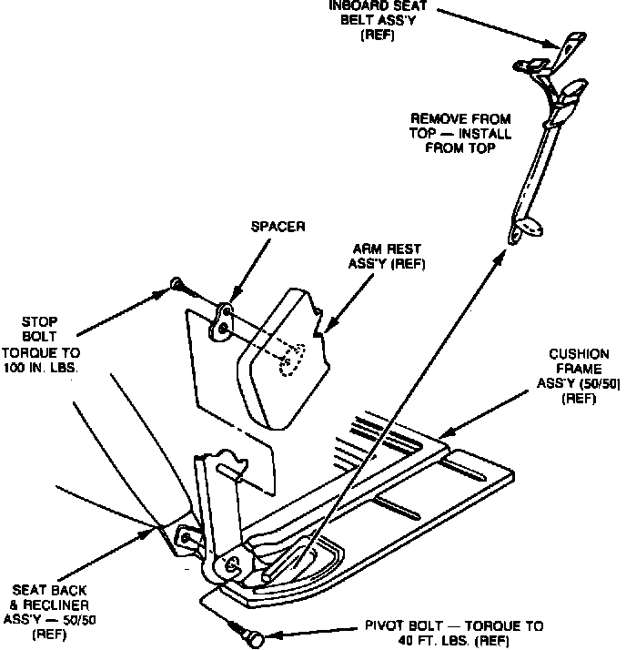 NOTE: VEHICLES WITH 50/50 SEAT - REASSEMBLY THE IN-BOARD SEAT BELT AND ARM REST ASSEMBLIES TO THE SEAT CUSHION ASSEMBLY.
