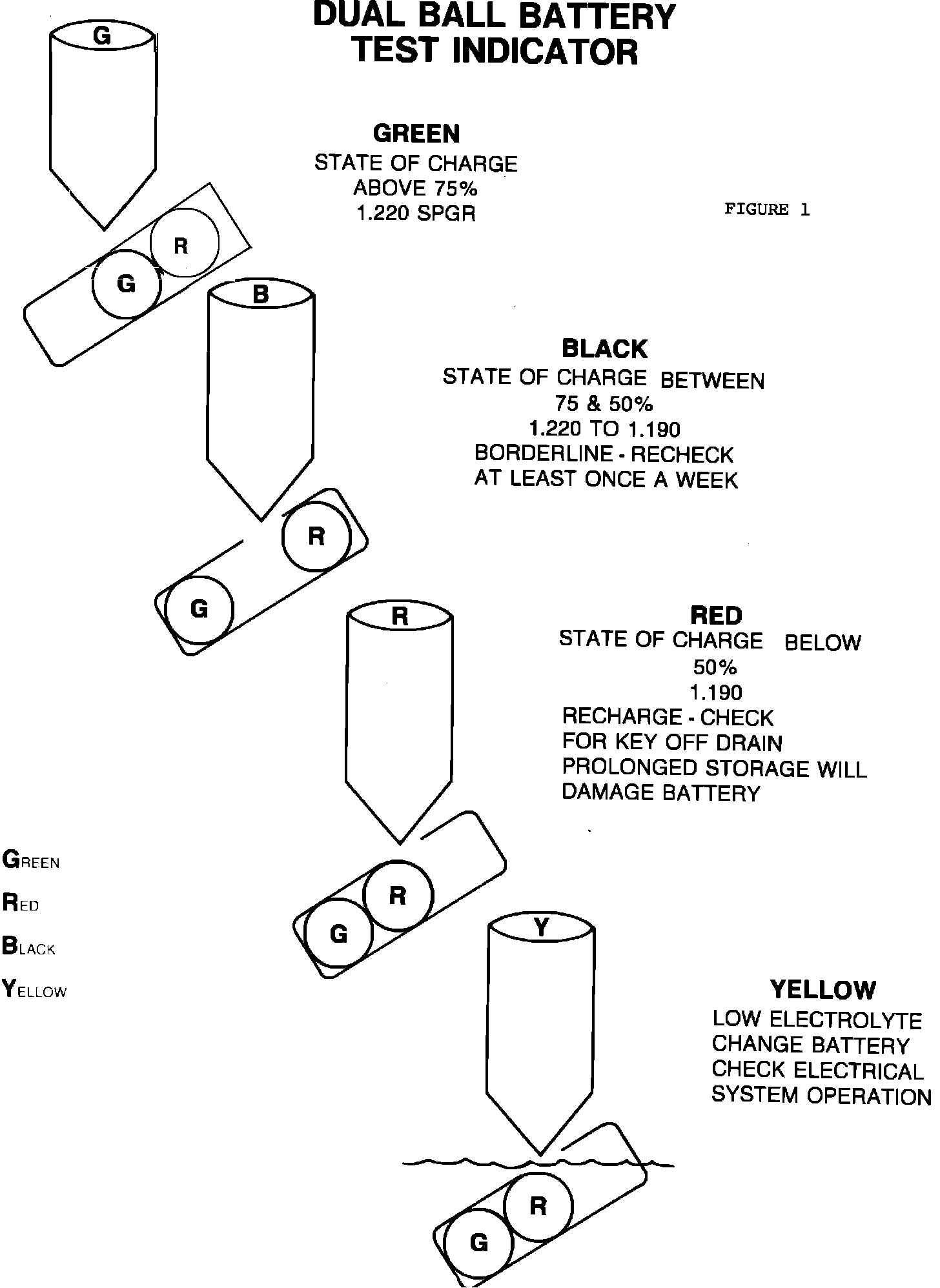 During the 1985 model year domestic vehicles will be equipped with a dual ball battery state of charge indicator. The new test indicator will function similar to the present indicator, but will have an added red indicator ball that will appear when the battery state of charge drops below 50 percent (Figure 1). Also, when the red ball appears, the battery state of charge is no longer adequate to assure reliable starting.