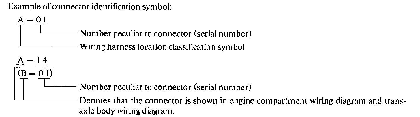 Those wiring harness connectors for device or wiring harness connection whose shape and/or location could differ due to different vehicle specifications are given a vehicle specification-dependent connector identification symbol (lower case alphabet) after a serial number of connector identification symbol to identify its dependence on vehicle specification. For detailed information on the vehicle specification-dependent connector identification symbols refer to "HOW TO READ CIRCUIT DIAGRAMS BY FUNCTIONS".