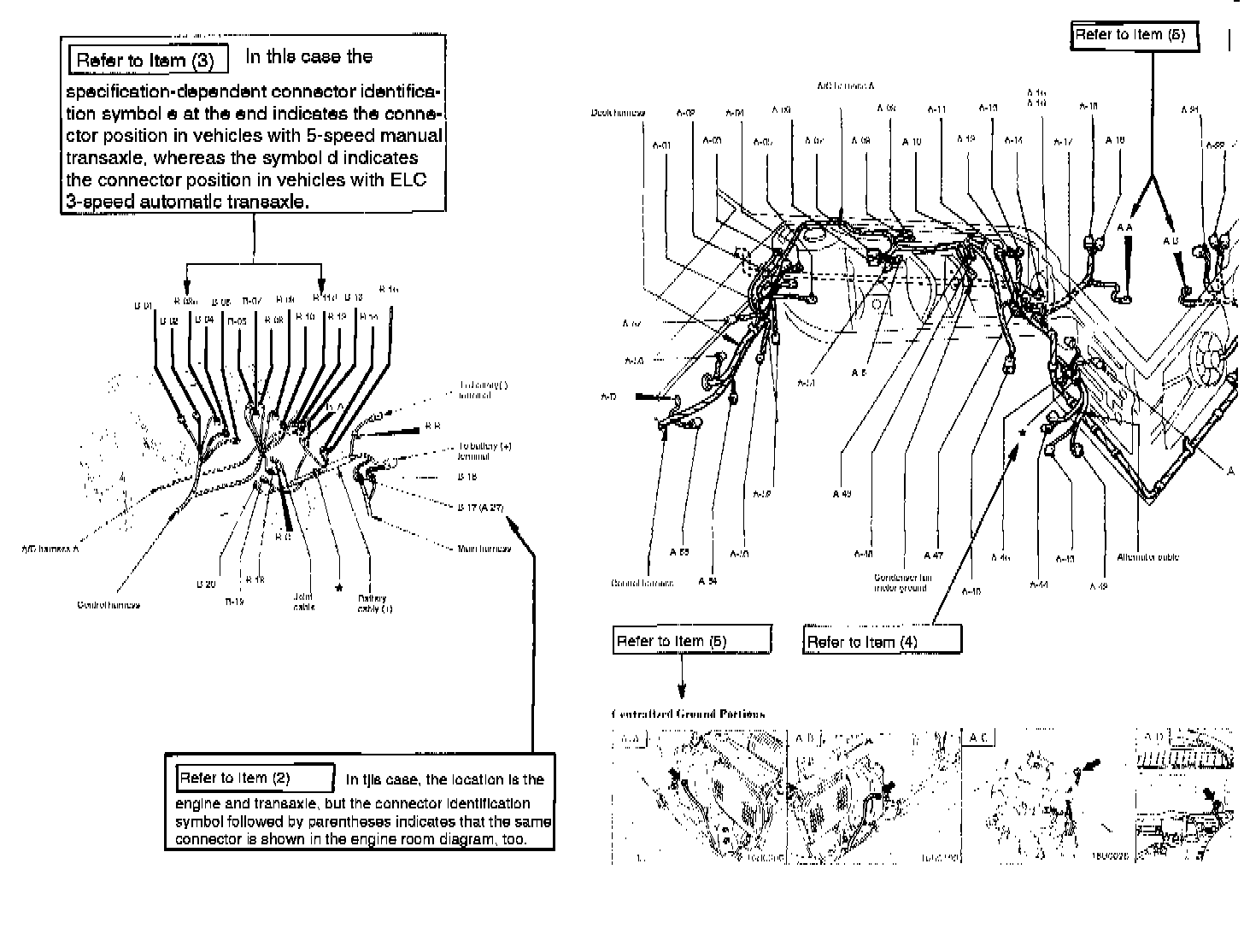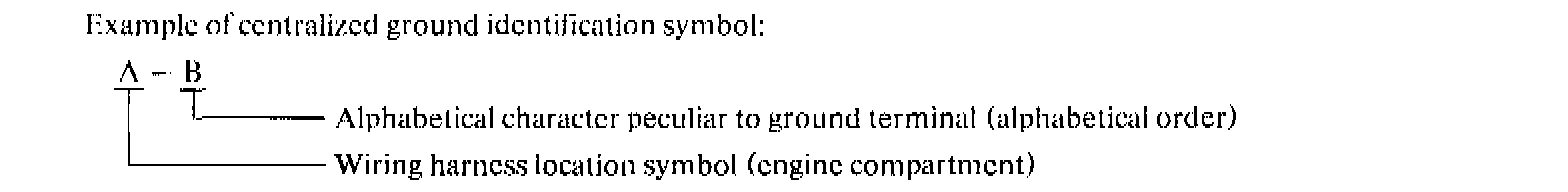 The approximate position of a centralized ground point is shown in a wiring harness configuration diagram and supplementary explanations arc given in a separate detail drawing. The centralized ground identification symbol consists of a wiring harness location symbol (A thru D) and an alphabetical character (upper case) in that order.
