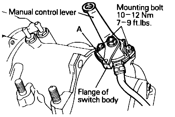 b. Rotate switch body until .472 inch wide end of manual lever (A) overlaps switch body as shown.