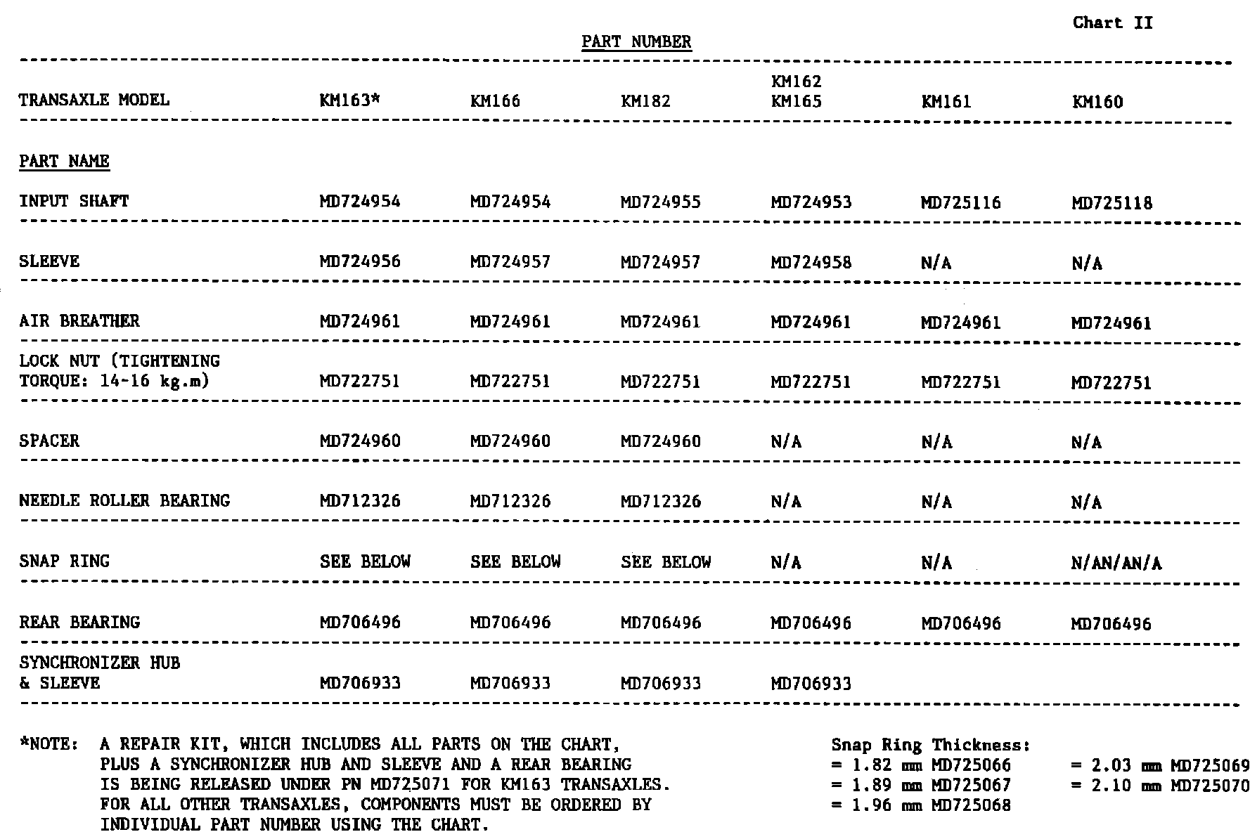 Use the attached Chart 2 to identify parts required for each transaxle application.