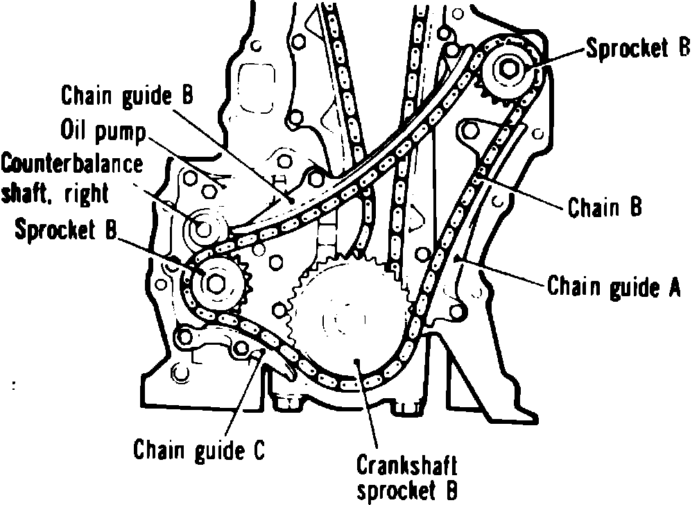 6. Install chain ``B'' on crankshaft sprocket, then the two counterbalance shaft sprockets ``B'' and tighten the lock bolts.