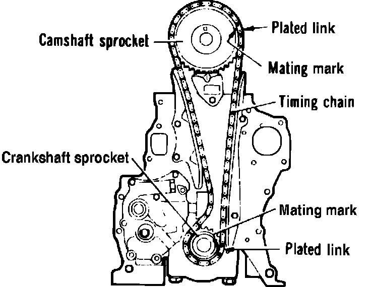 2. Install camshaft sprocket and crankshaft sprocket on timing chain. When the sprockets are installed, ensure the mating marks of the chain and sprockets are properly aligned. The mating marks on the sprockets are punched marks on the corresponding teeth. The marks on the chain are two plated links, Fig. 46.