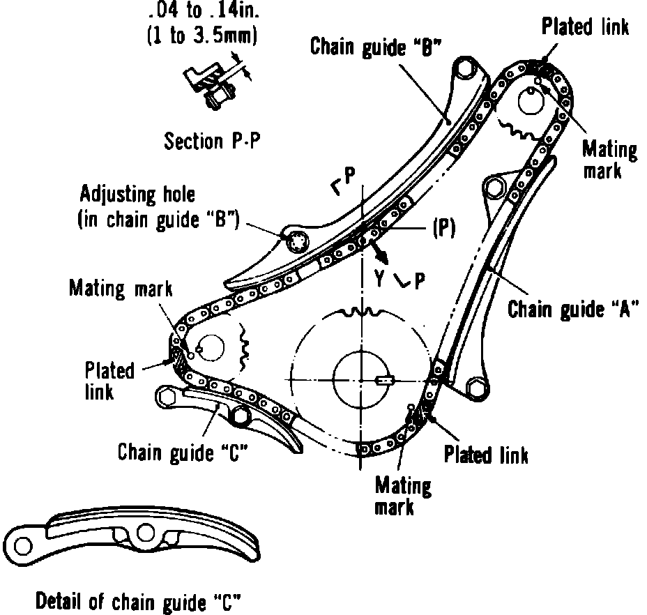 9. Shake right and left sprockets ``B'' to collect chain slack at point ``P,'' Fig. 47. Adjust position of chain guide ``B'' so when the chain is pulled in direction of arrow ``Y,'' Fig. 47, the clearance between chain guide ``B'' and the links of chain ``B'' will be 0.04 - 0.14 inch. Tighten chain guide ``B'' mounting bolts.