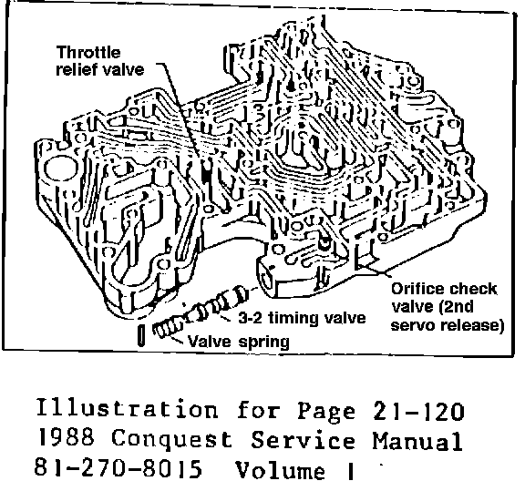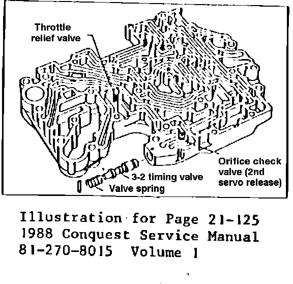 The JM600 transmission for 1988 model year Conquest vehicles, contains one valve body orifice check valve, instead of three as was used for the 1985, 1986, and 1987 Conquest JM600 transmissions. This change from three check valves to one was effective with transmission No. MR604.