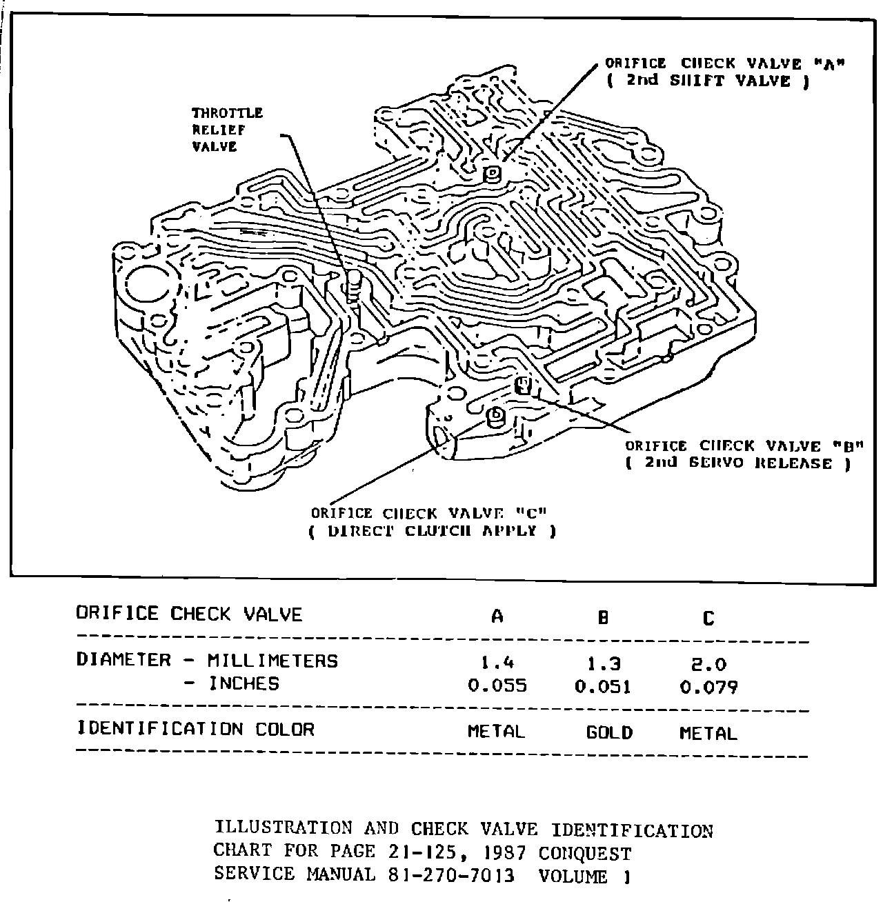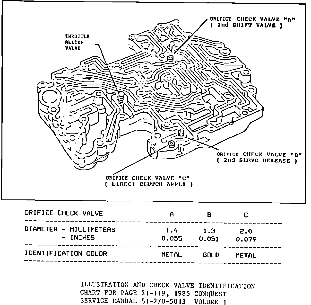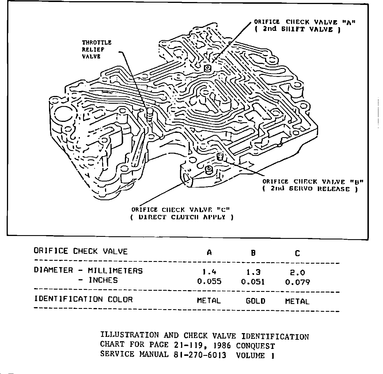 In addition to the above, orifice check valve identification information (color coding) was inadvertently omitted from the 1985, 1986, and 1987 Conquest Service Manuals. The check valves are color coded to ensure that the different diameter valves are installed in their proper places.