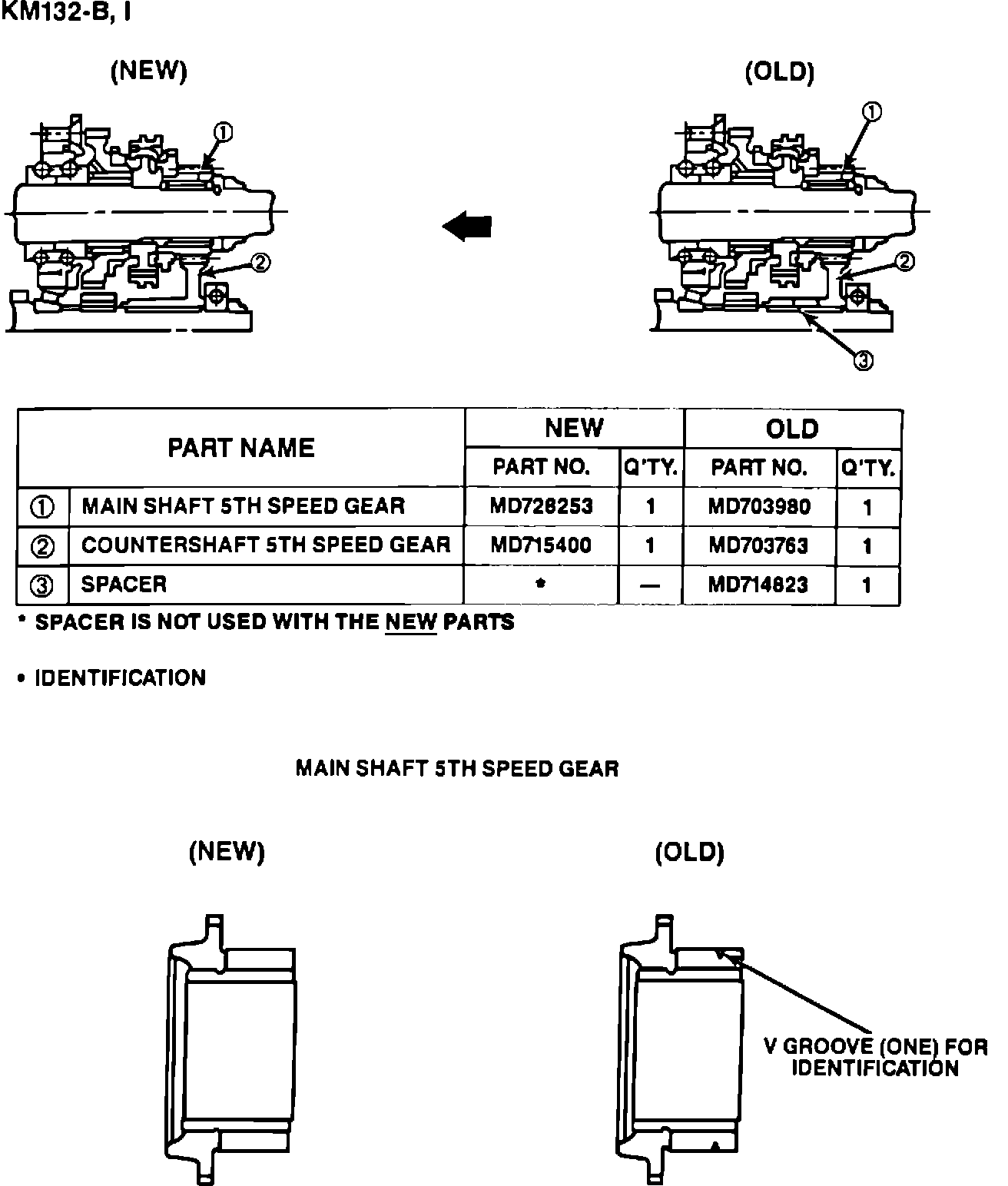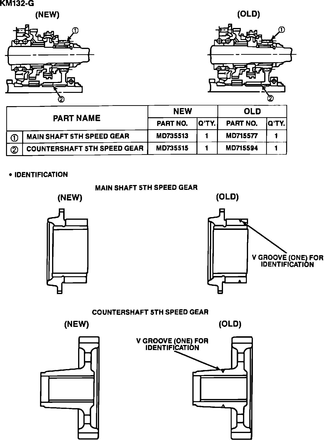 If the 5th gear system requires reconditioning, the new 5th speed main shaft gear and 5th speed countershaft gear should be installed. Refer to Figure 1 for the gear part numbers and visual identificatioin details on the KM132-B transmission and Figure 2 for the KM132-G transmission.