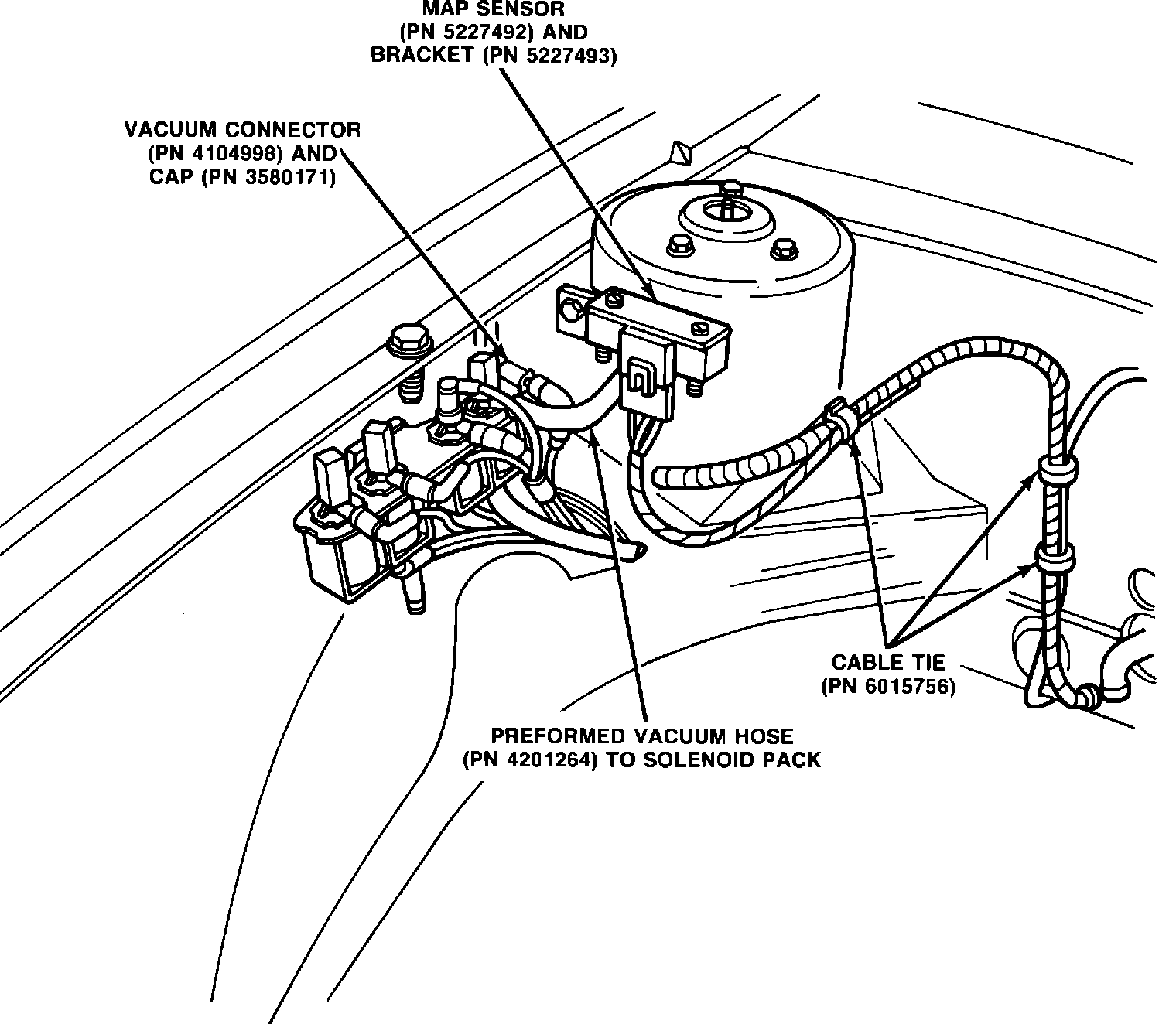 c. Cut 1" off of formed vacuum hose, PN 4201264, and connect to solenoid nipple. This MAP sensor vacuum line should not have any kinks and should be installed to have a downward slope from the MAP sensor to the solenoid pack.