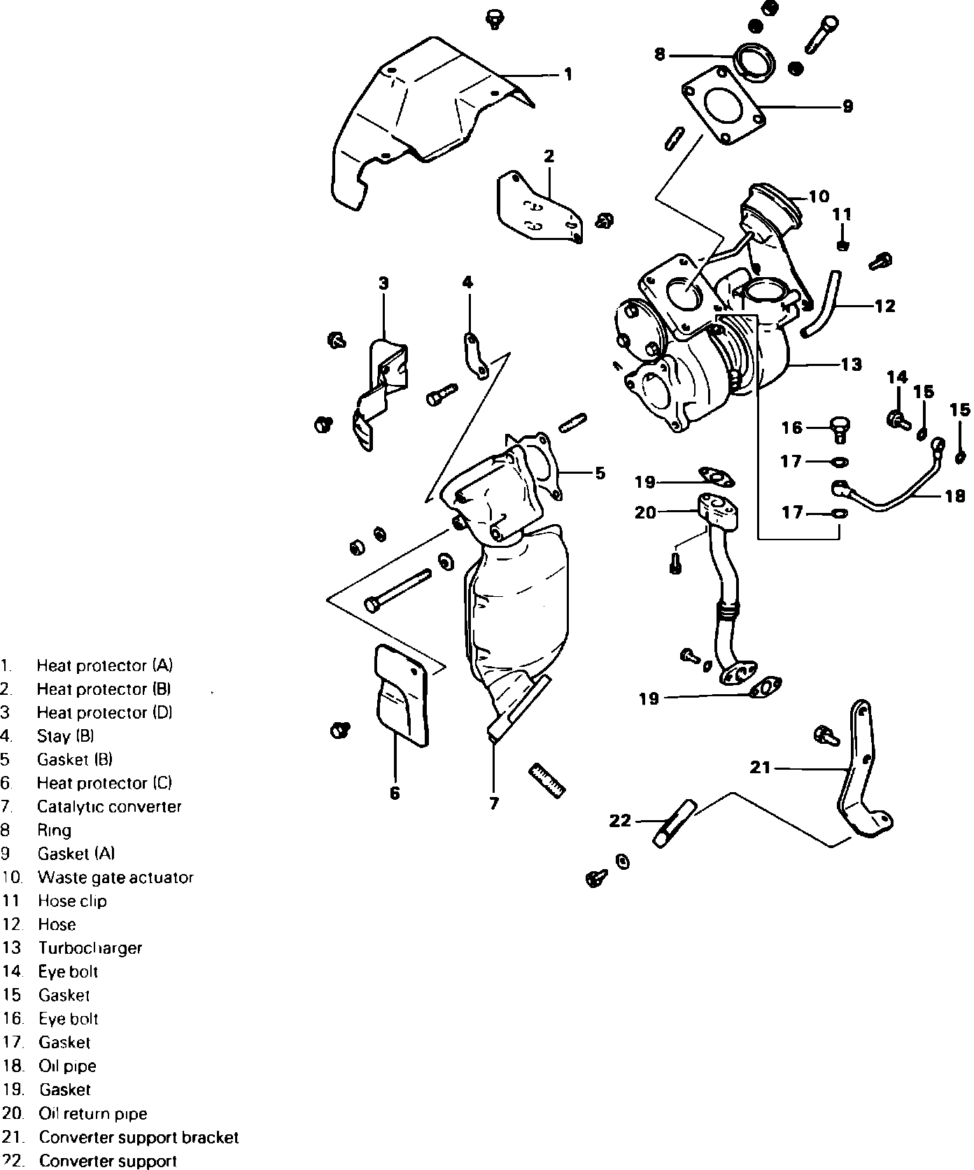 Fig. 1 Exploded view of turbocharger assembly. 1985-86 Models w/1600cc engine: