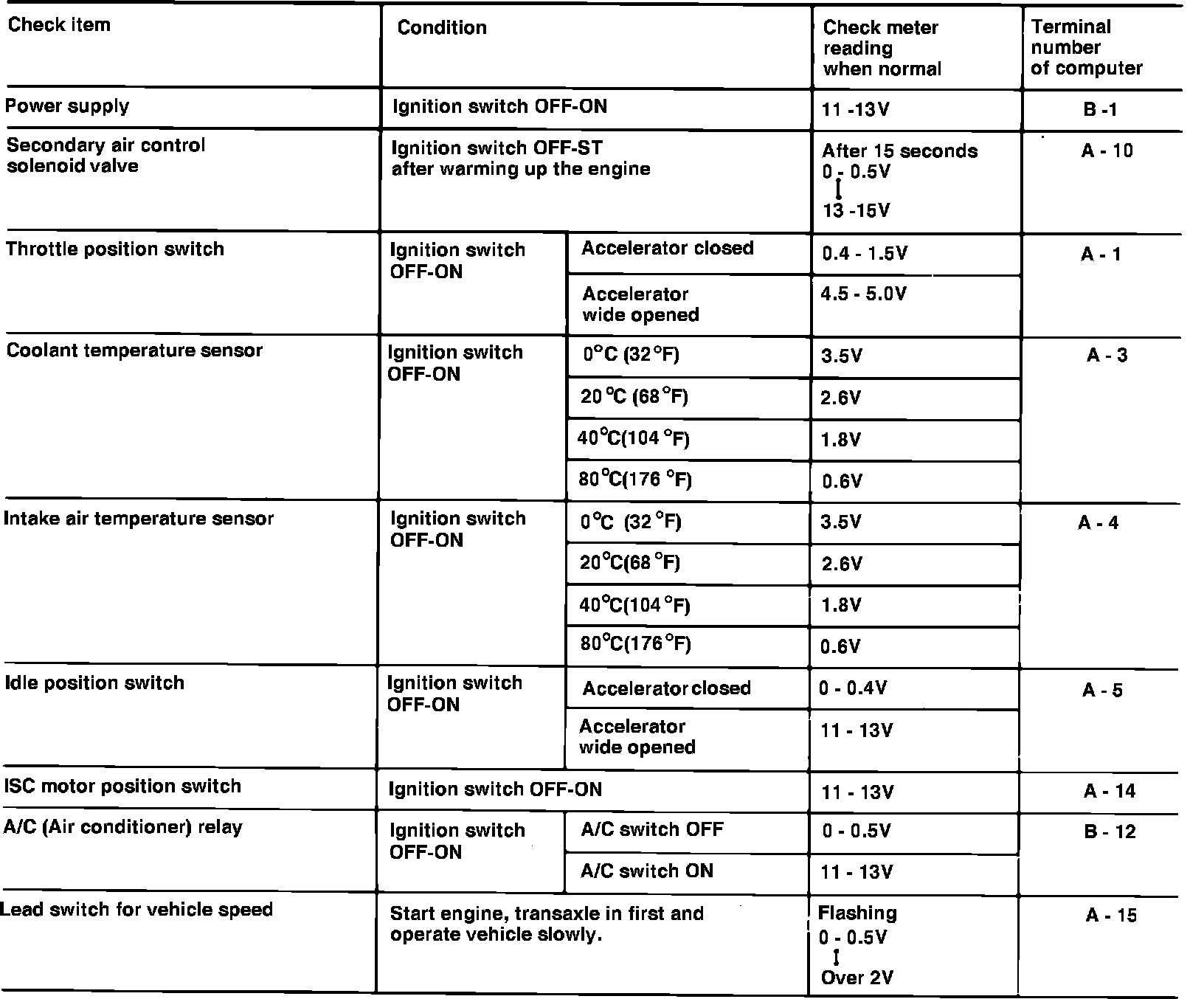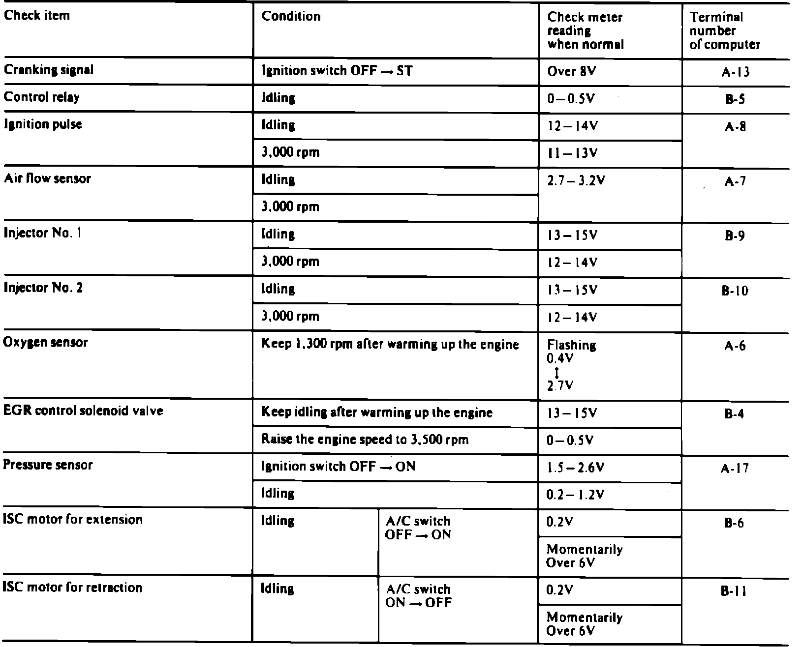 When checking the ISC motor position switch, if ignition switch is turned on for 15 seconds or more, the reading will drop momentarily below 5 volts. When checking pressure sensor with engine idling, the reading will increase momentarily to 1.5-2.6 volts every 2 minutes.
