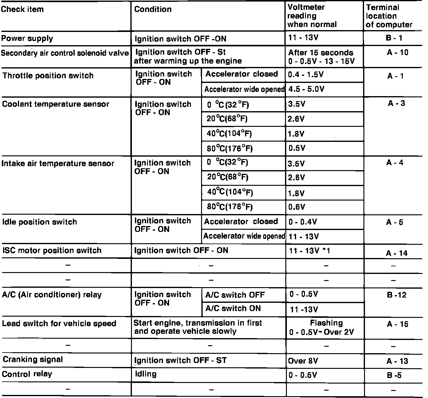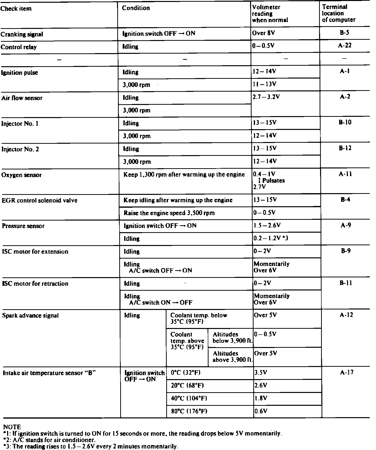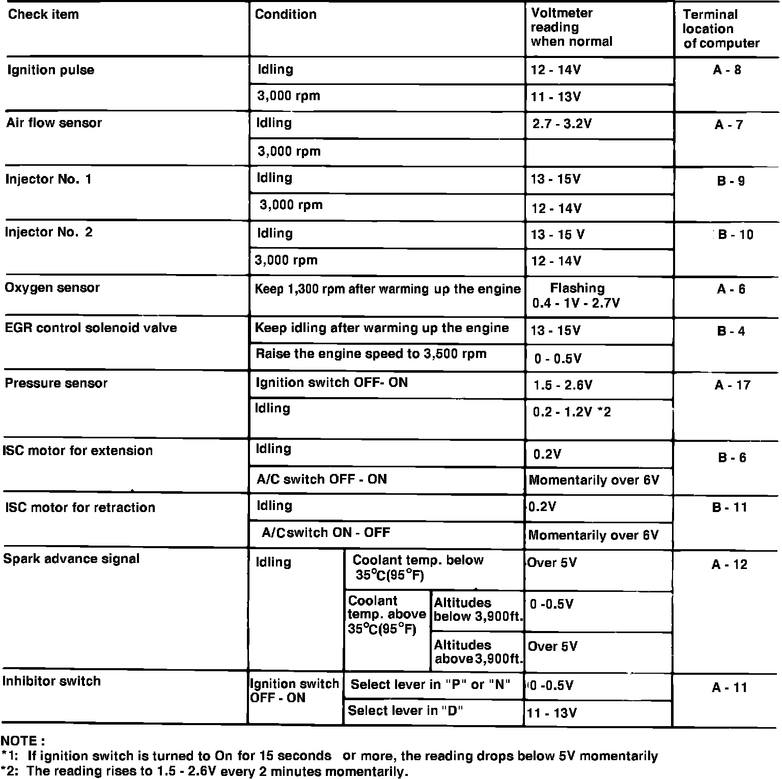 When checking the ISC motor position switch, if ignition switch is turned on for 15 seconds or more, the reading will drop momentarily below 5 volts. When checking pressure sensor with engine idling, the reading will increase momentarily to 1.5-2.6 volts every 2 minutes.