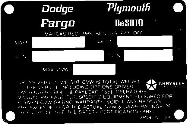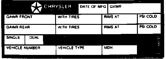 A vehicle safety certification label, Figure 2, is attached to the rear facing of the driver's door on all models. This label reflects the date of manufacture numerically month and year in the upper right hand corner, Gross Vehicle Weight Rating (GVWR), Gross Axle Weight Rating (GAWR) front, Gross Axle Weight Rating (GAWR) rear and Vehicle Identification Number (VIN). A Month-Day-Hour (MDH) number is included on this label in the lower left hand corner which indicates a Month, Day and Hour manufacturing control point.