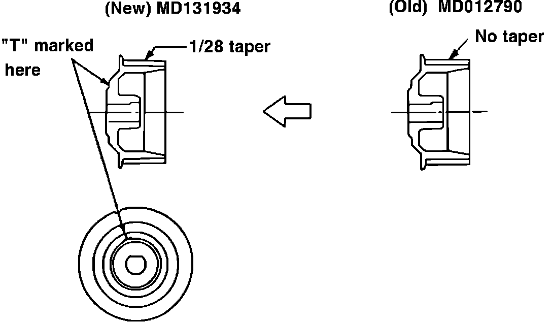 Effective in February, 1988, with Engine No. FT9425 and later, the oil pump sprocket has been changed to a tapered design to reduce timing belt noise. The new tapered design sprocket can easily be identified by the letter "T" stamped on it as indicated in Figure 1. The new sprocket is interchangeable with earlier built engines. The part number of the new sprocket is MD131934.