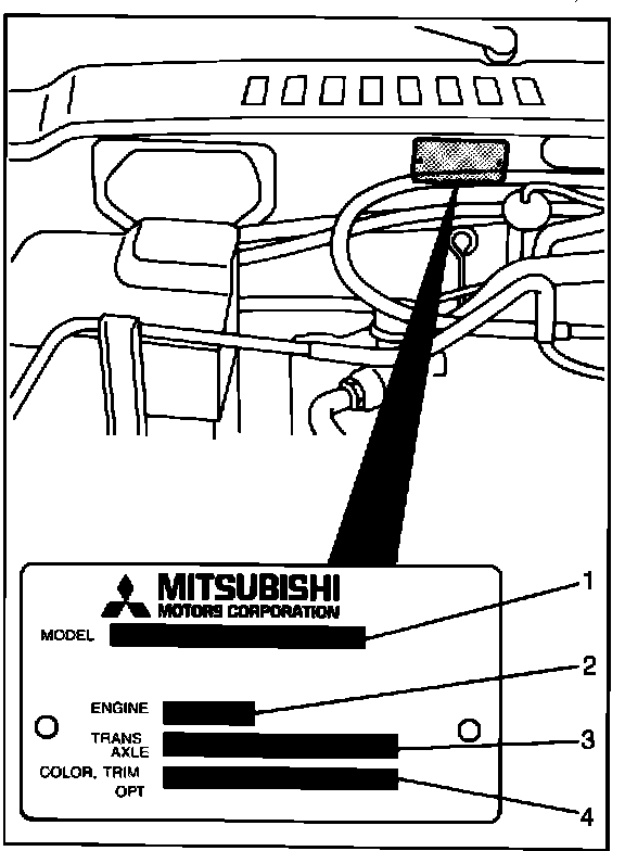 Vehicle information code plate is riveted on the headlight support panel in the engine compartment. The plate shows model code, engine model, transmission model, and body color code.