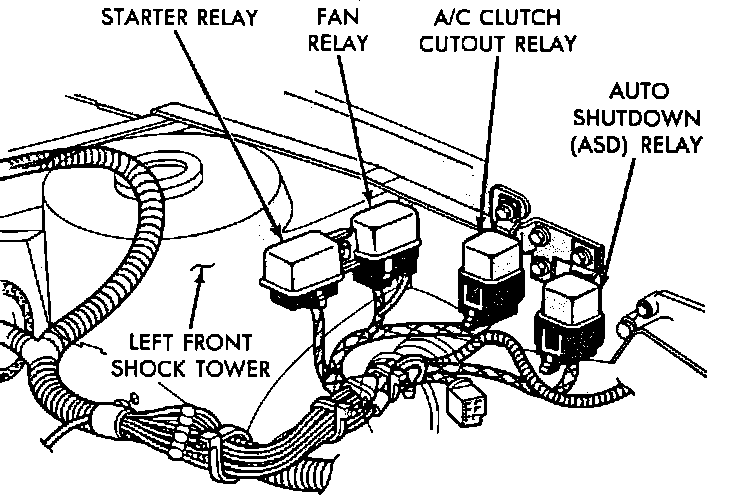 The Auto Shutdown (ASD) relay is located in the engine compartment in front of the left strut tower.