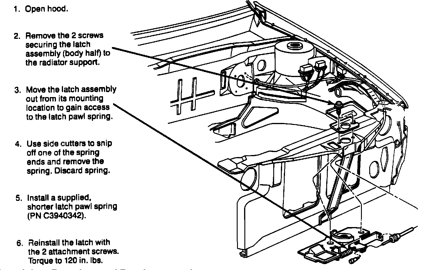 The primary hood latch on the listed model cars may release when it is jarred by vehicle travel over a rough surface or in an abrupt turn. The secondary latch will remain engaged and hold the hood down. To prevent the primary latch release condition, the lower hood latch bracket spring must be replaced with a revised, shorter spring increasing the spring force on the latch pawl.