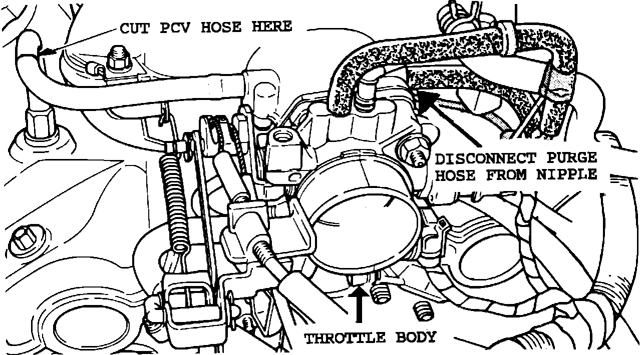 9. Disconnect the intake manifold end of the formed purge hose that extends from the intake manifold nipple to the "F" shaped connector (Figure 2).