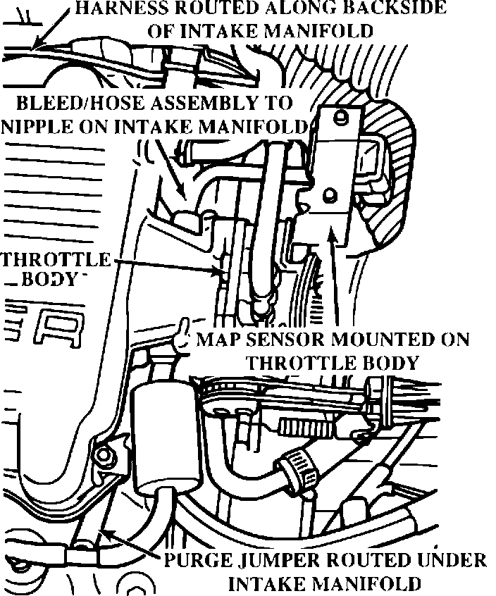NOTE: TO PREVENT INTERFERENCE WITH THE THROTTLE LINKAGE, THE PURGE JUMPER ASSEMBLY MUST BE ROUTED UNDER THE INTAKE MANIFOLD (Figure 5). DO NOT ROUTE IT OVER THE TOP OF THROTTLE LINKAGE.