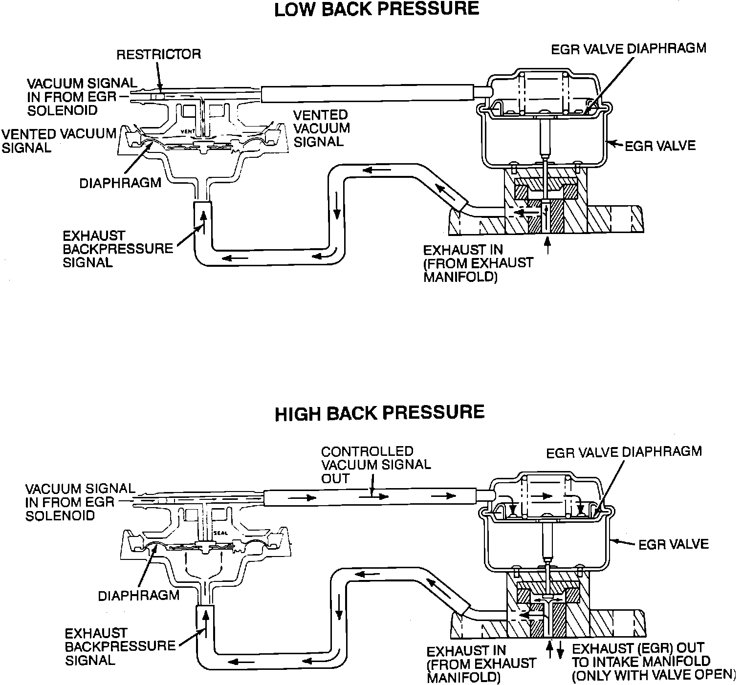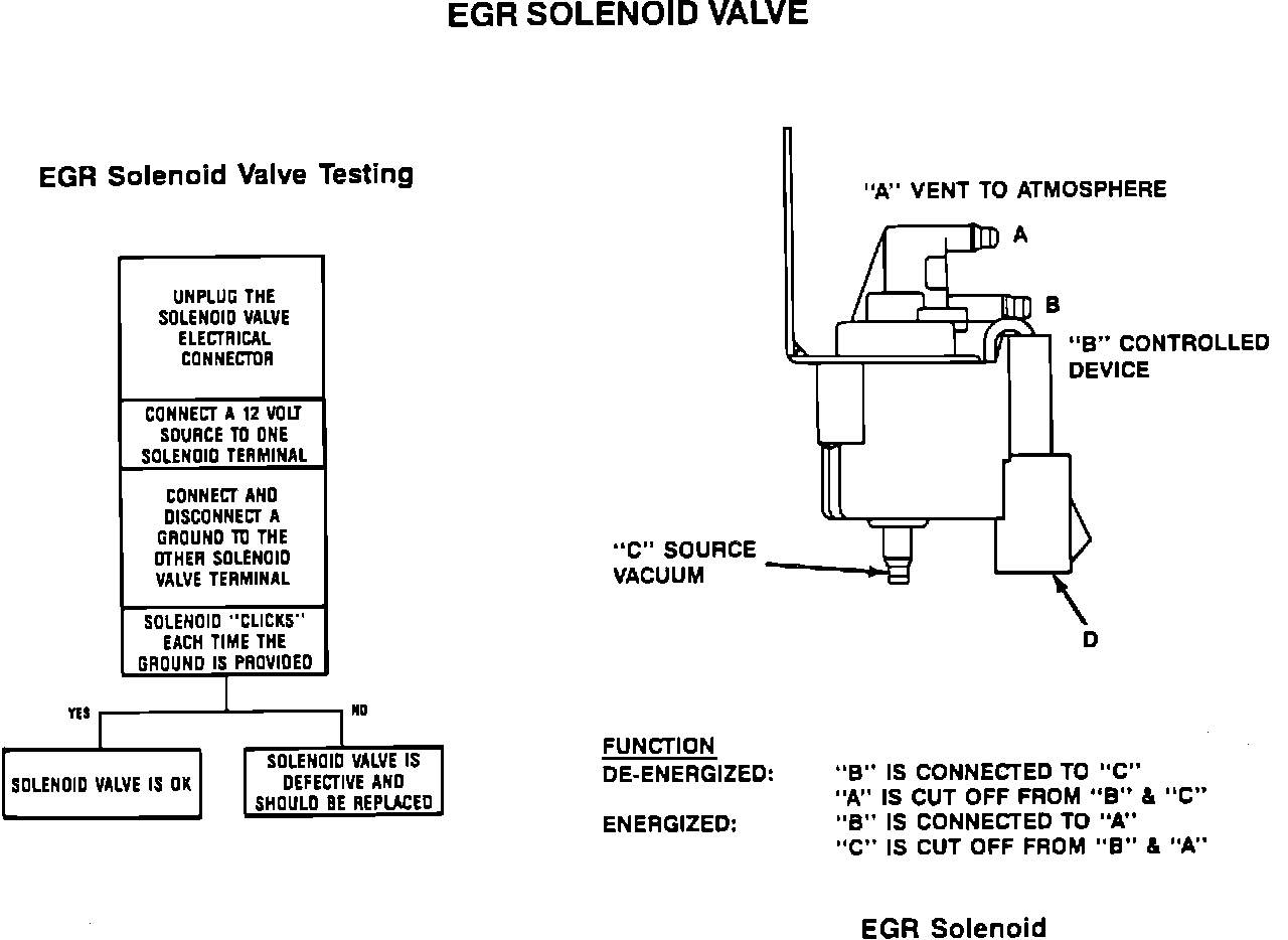 If control system is functioning properly, the valve and passages may be checked for exhaust gas flow. Slowly apply vacuum directly to the EGR valve with the engine warm and idling in neutral. Idle speed should drop 150 RPM or more. Engine speed should start to drop when vacuum reaches 2.0 to 3.5 inches Hg. This reduction in idle speed confirms that exhaust gas recirculation is taking place. If the speed change does not occur, or is less than that specified, exhaust deposits in the EGR valve or intake manifold EGR passages are indicated.