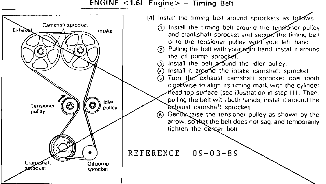 This bulletin covers a revised procedure for the installation of the cam shaft(s) timing belt on the 46G (1.6L DOHC) engine. Step (4) on Page 9-120 of the 1989 Colt/Summit/Colt Series 2000 Service Manual (81-270-9011) has been revised to simplify the timing belt installation.