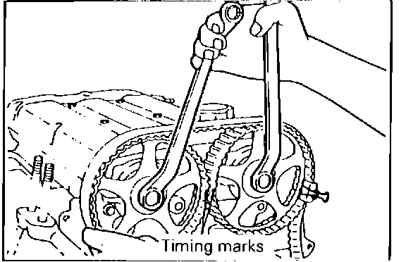 (2) Install the timing belt around the exhaust sprocket, aligning the timing marks with the cylinder head top surface using two wrenches.