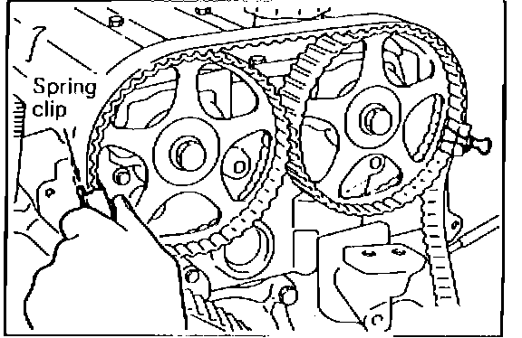 (4) (1) Install the timing belt around the intake camshaft sprocket and retain it at indicated position with a spring clip (binder clip).