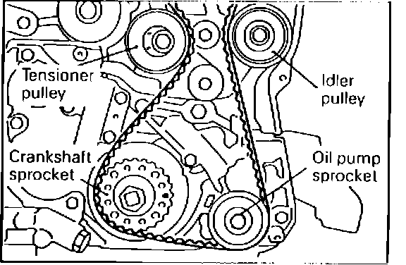 (4) Install the timing belt around the idler pulley, oil pump sprocket, crankshaft sprocket and the tensioner pulley in the order shown.