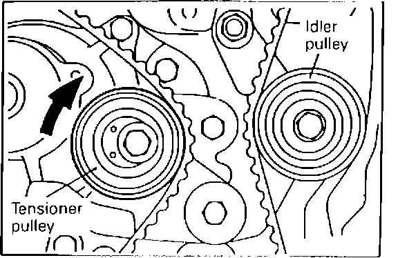 (6) Lift up the tensioner pulley in the direction of arrow and tighten the center bolt.
