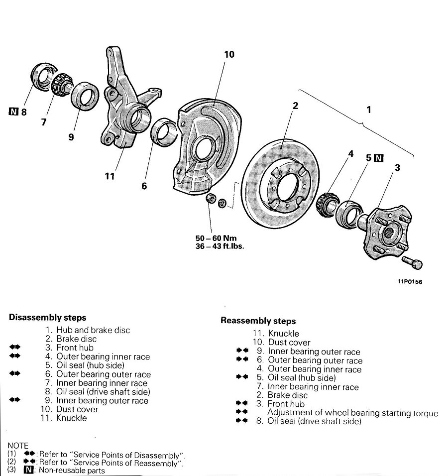 2. If the front hub and knuckle are disassembled by striking them with a hammer, the bearing will be damaged.