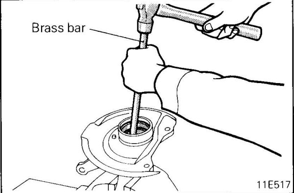 - Drive out the bearing outer races from the knuckle by tapping them uniformly using a brass bar and hammer.