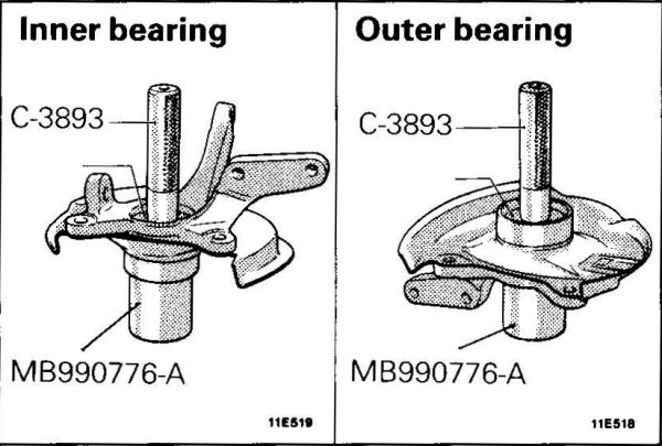 - Remove the outer bearing inner race from the hub by using the special tools.