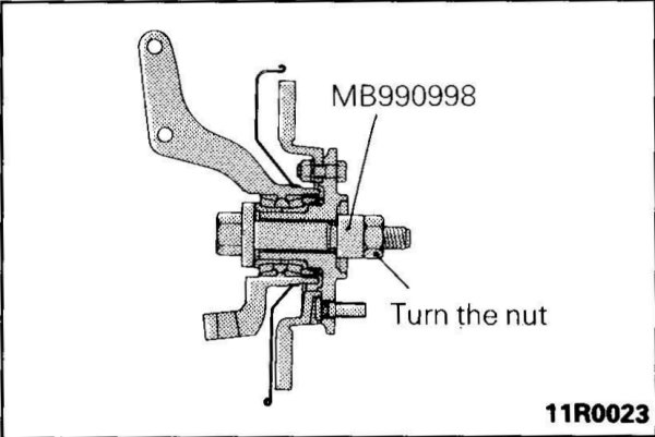 3. After making sure that the special tools are set up correctly, turn the nut in the tightening direction while holding the bolt to remove the front hub from the knuckle.